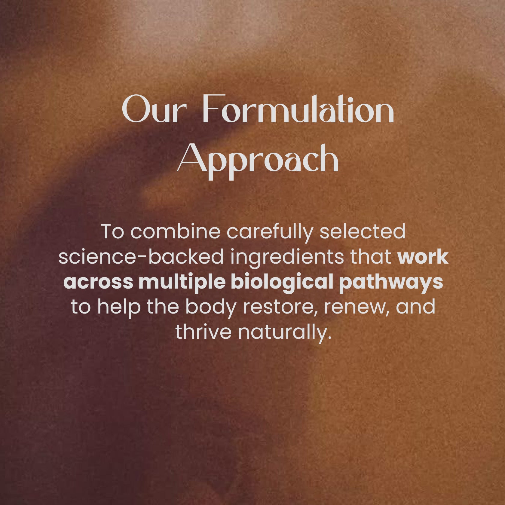 The human body already carries powerful ways to repair and protect itself. Our role is to work with that system, not against it. Each formula combines nature-derived compounds with clinically informed doses to quietly support your own healing processes, so you can move through aging more naturally: with steadier energy, stronger day-to-day health, and better protection against age-related concerns.